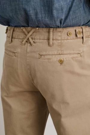 – Zip-fly closure, adjustable tabs at the waist, Corozo buttons, and coin pocket detail.