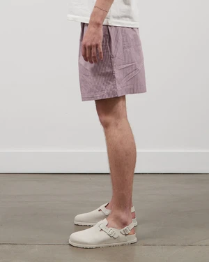 The first collaboration between Birkenstock 1774 and Copenhagen-based bedding label Tekla, the Mauve Stripe Shorts are a cotton poplin short with a drawstring waistband, shown here in a fine purple and white stripe. Equally suited to daily lounge wear or elevated summer short, the Mauve Stripe Shorts have a mid rise, elastic waistband, front darts, side slip pockets, rear patch pockets and a mother of pearl button fly. Crafted from 100% organic cotton. Manufactured in Portugal. Model is 192cm and wears a size Medium.
