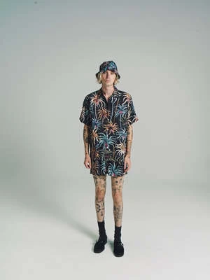 Palm trees dance on the midnight breeze; Intricately painted in hues of pink and gold and wrapped in the spell of a waking dream. In alchemical traditions, the palm tree is a symbol of androgyny as it possesses the perfect integration of both male and female attributes. This is an alchemical achievement to be wholly, pristinely balanced and equally united with polarity. To Assyrians and Egyptians, the palm is considered a tree of life. It was sacred to Ishtar and Astarte, as well as to Nut and Hathor. These deities utilised the palm trees nectar to keep the dead in a semi- animated state while they awaited their fate in the Underworld. Sometimes the fruit of the palm would keep these souls in this state of undead forever. The date palm is also associated with the sun god Ra as a resurrection figurehead. Includes; Gold / Multi Eco Satin Silk Fabric, Original Artwork, Camp Collar, Short Sleeves, Straight Hem, & Mother of Pearl Buttons. Limited Edition of 100. Made in Bali, Indonesia. For Every Item Sold We Plant 3 Trees