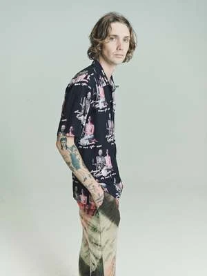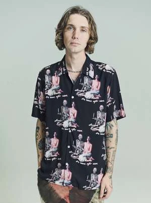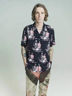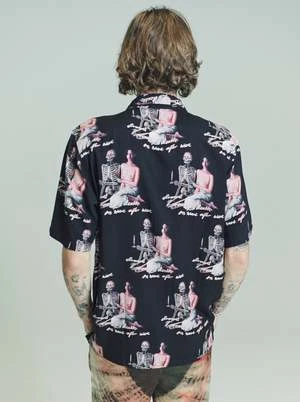 Mystery is inherent in this dreamlike image. Painted in a surreal manner reminiscent of Ren Magritte and Paul Delvaux. A woman wrapped in a white robe, sits in a starlit garden under the blue night, in her hand she holds a crimson rose. She is mirrored in her pose by a skeleton who holds a candle in a disarming, pictorial display. The skeleton, candle and flower are classic vanitas themes symbolising: life, death, rebirth and reminding the viewer of the transience of life and the certainty of death. The image is accompanied by hand-painted cursive text, graffitied over the image are words taken from the poem titled, And this I dreamt, and this I dream. “And this I dreamt, and this I dream, And some time this I will dream again, And all will be repeated, all be re-embodied, You will dream everything I have seen in a dream. To one side from ourselves, to one side from the world Wave follows wave to break on the shore, On each wave is a star, a person, a bird, Dreams, reality, deathon wave after wave.” Arseny Tarkovsky, Life, Life, trans. Virginia Rounding. Features include; Black / Multi Eco Vero Fabric, Original Artwork, Camp Collar, Short Sleeve Shirt, Straight Hem, Mother of Pearl Buttons, 100% Eco Vero Ethically Produced by Lenzing. Limited Edition of 100. Made in Bali, Indonesia. For Every Item Sold Endless Joy Plants 3 Trees.