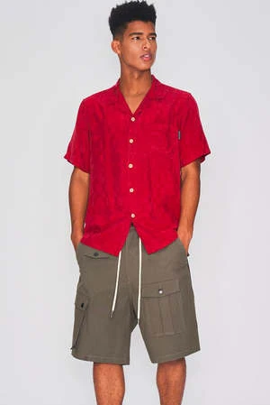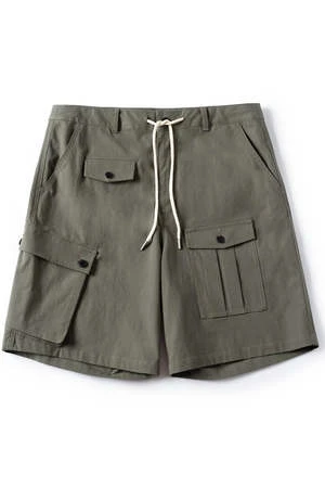 A boxy fitting short with tailored details at waist with belt loops and draw string cord. Slanted hip pockets with multi cargo and bucket pockets through out the shrots front and back.