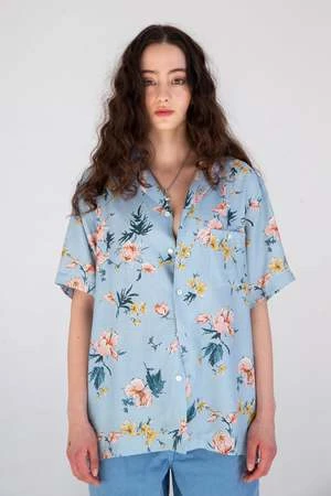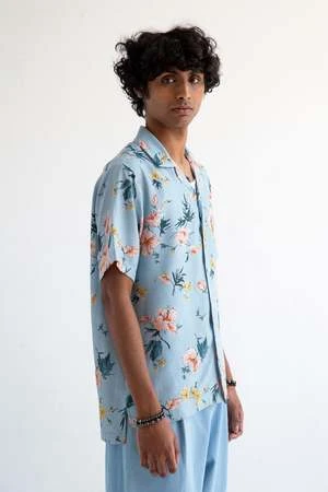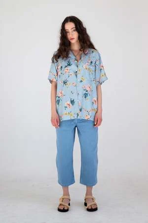 Taking inspiration from nature, we tailored our ‘Desi’ camp collar shirt in a light blue Hibiscus print. Printed in Japan on soft rayon poplin, the print is based on traditional Japanese Ukiyoe artist painting methods from the 17th century.