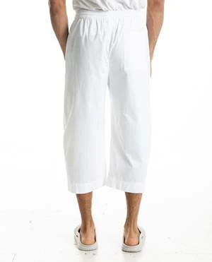 Ovate Baggy Pant in white by Grei. This wide-leg pant tapers in towards the bottom giving an oblong shape. Fine cotton twill fabric drapes effortlessly on the body for a comfortable fit, great for warmer seasons.
