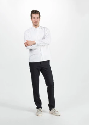 Homecore’s Wool Davis Pant is a beautiful navy lightweight wool in a standard fit. Two classic side slash pockets and two back welt pockets. Hidden button up with hook and bar closure. Belt loops. Finished raw bottom edge. Unlined.