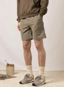 Short is a relaxed fit with elasticated waist, designed for movement and comfort. Details include draw cord on waist, two front laid on pockets and a back zip welt pocket.