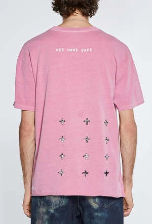 Oversized fit short sleeve t-shirt with raw-cut back hem reverse overlocked side seam and signature rats tail. Made from a premium cotton jersey in an overdyed faded pink with an aged wash. Features digitally printed artwork Finished with signature t-box and XL 4×4 digital prints to match.