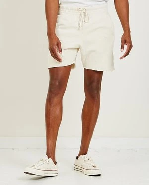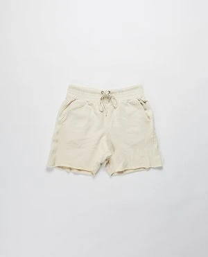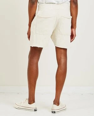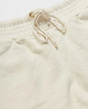 The Yacht short in ivory by Les Tien. Made of super-soft cotton with a vintage feel. These shorts feature a wide elastic waist with drawstring, side pockets, back patch pocket, and an unfinished hem.