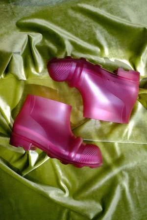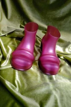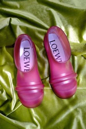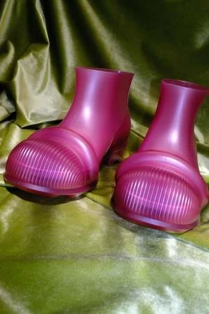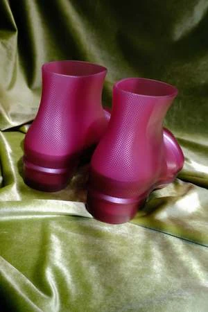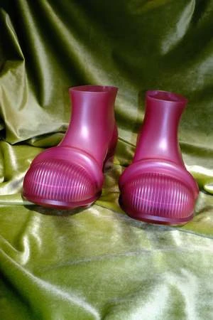 Transparent Red Pull-on Ankle Boot in Rubber with an Emphasized Silhouette, Ribbed Toe and Rubber Sole. Custom Loewe Insole.