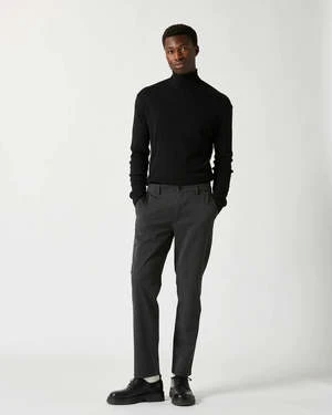 A pair of cool chino pants crafted from recycled polyester, viscose and elastane for a soft and stretchy quality. The pants have a regular fit with straight legs, that are more narrow at the bottom. They feature button and zipper closure, belt straps, slanted side pockets and welt pockets at the back. The model is 193 cm tall and wears a size 32.