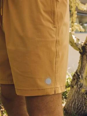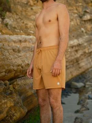 Mollusk – Stretch Vacation Trunks in Papaya. Refined board short made of flexible 4-way stretch nylon and features: an elastic waistband, rubber-tipped waistband tie that will never fray, front hand pockets, a minimal back patch pocket with velcro closure and hidden key loop, and a reflective sun logo on the left leg.