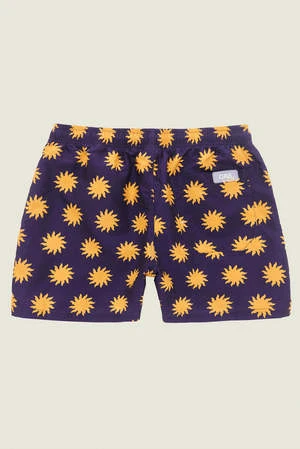 The Sunday Sun print is inspired by sunny Los Angeles. The dark blue and warm yellow print lets you take the sun with you wherever you go. The quick-drying pair of swim shorts are designed with four pockets including a hidden zip pocket on the side and a mesh lining. Created for comfort and style, the swim shorts are lightweight, true in size, and have a peach finish.