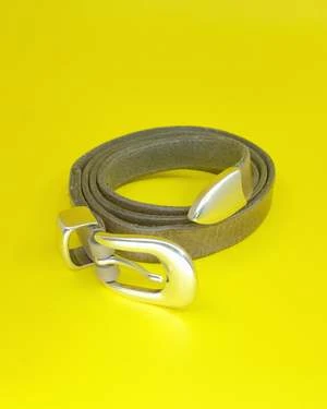 Our Belt 2 cm in Grey Leather. Produced in a French calf leather, the belt is 2 cm wide and features a metal pin buckle closure, a metal keeper, a metal tip and a dust bag cover.