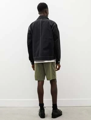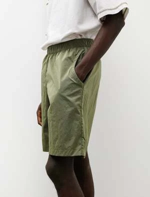 Wide fitting shorts that sit just above the knee cut from a super dense, lightweight nylon plain weave with a subtle lustre in a classic olive green. Feature a minimal elastic waistband and unique front slash pockets that curve out from the side seam. With a wide leg opening, these shorts offer good airflow for hot weather and provide a relaxed silhouette complimented by the technical fabric. Durably constructed with french seams throughout and bartack reinforcement at the pockets for a hard wearing finish that will last many years to come.