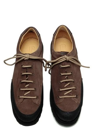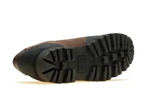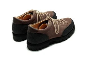 Inspired by climbing footwear of the 1970s, this robust model was designed with rubber strips around the front and back of the shoe to provide better grip on rocky surfaces during steep climbs.