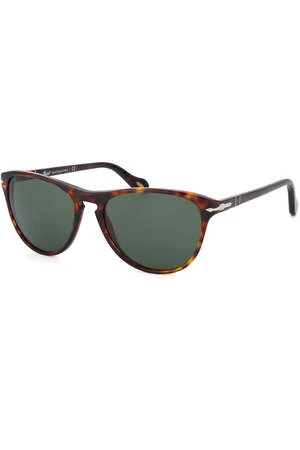 Classic unisex Persol oval silhouette sunglasses with black crystal green lenses. Features logo on both inner arms.