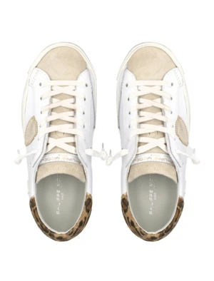 The Philippe Model PRSX Low Sneaker in Leo Blanc Brun (Leopard White Brown) is made from a Leather Upper, Leather Inner and Rubber Sole