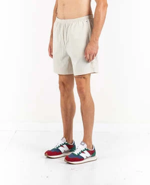 4-way stretch athletic short in sand by RLX Ralph Lauren. Combining four-way-stretch fabric, breathable mesh panels, and moisture-wicking properties, these shorts also feature angled front pockets, interior drawstring, and laser-cut perforation at the back.