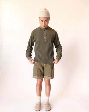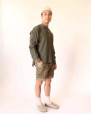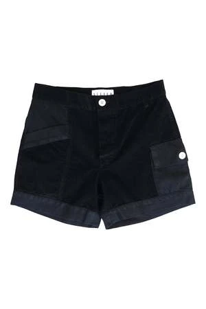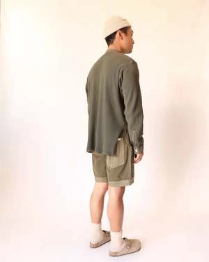 Unisex, organic, sustainably-sourced hemp-cotton blend, lightweight washed canvas Trek Short with contrast corduroy patchwork.