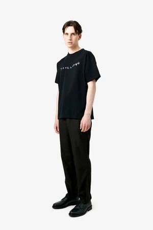 Erich is regular cut suiting pant. Slanted front pockets and welted pockets at back. Elasticated waistband. Press folds at front and back. Small embroidered Soulland patch above back pocket