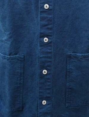 A generous fitting button front over shirt cut from a “barley twist” cotton with a textured stripe that has been dyed to a rich indigo blue as part of Tender’s ongoing “Achilles Heel” series. Features a collarless neckline finished with an exposed facing, two patch pockets at the waist and a gently curved hem. The roomy chest accompanied by a subtle drop shoulder make for a dynamic silhouette that responds well to movement. Constructed with Tender’s trademark attention to durability using chain stitched flat felled seams throughout for a hard wearing finish that is built to last; hand cast pewter buttons.