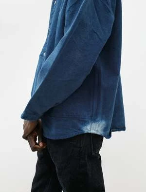 Achilles Heel garments are dip dyed in indigo with one portion left out from the dye bath. For this shirt the light spot is featured at the hem of the side seams.