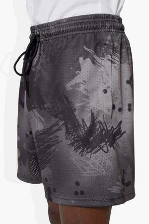 Camo scratch Printed basketball short are made with an elastic waistband and adjustable inner drawstring. has a relaxed straight fit above the knee with a 5 inch inseam and two front side pockets.